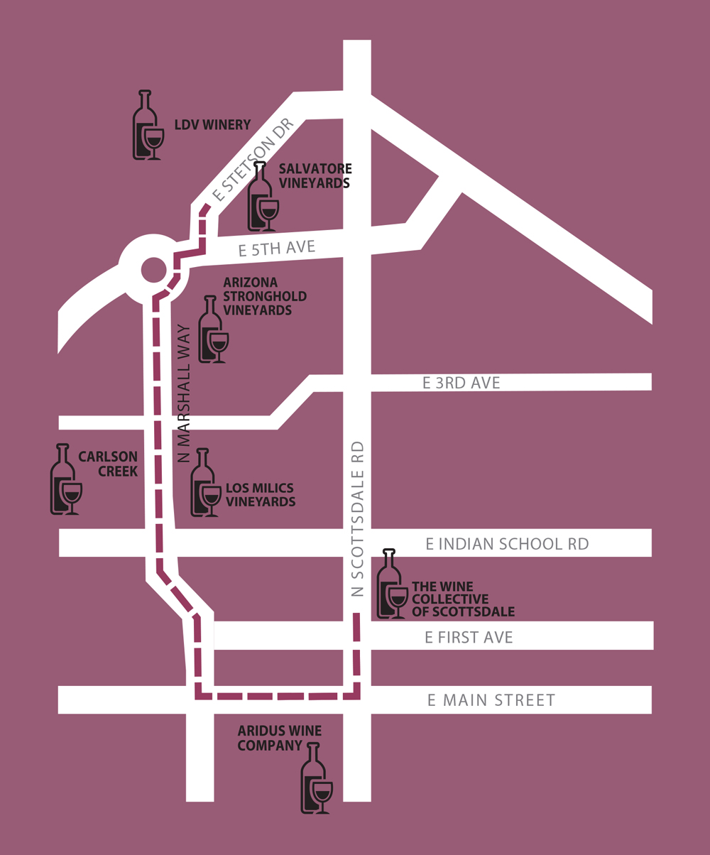 Make downtown Scottsdale your destination for wine tasting! Explore the Scottsdale Wine Trail and make a day, or weekend, experiencing Arizona wines. You don’t have to complete the wine trail in one day. Each winery has a unique tasting room offering a variety of delicious wines to try and purchase. Please check with each location.